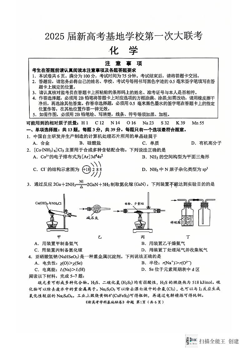 江苏省南通市新高考基地学校2025届高三上学期12月月考化学