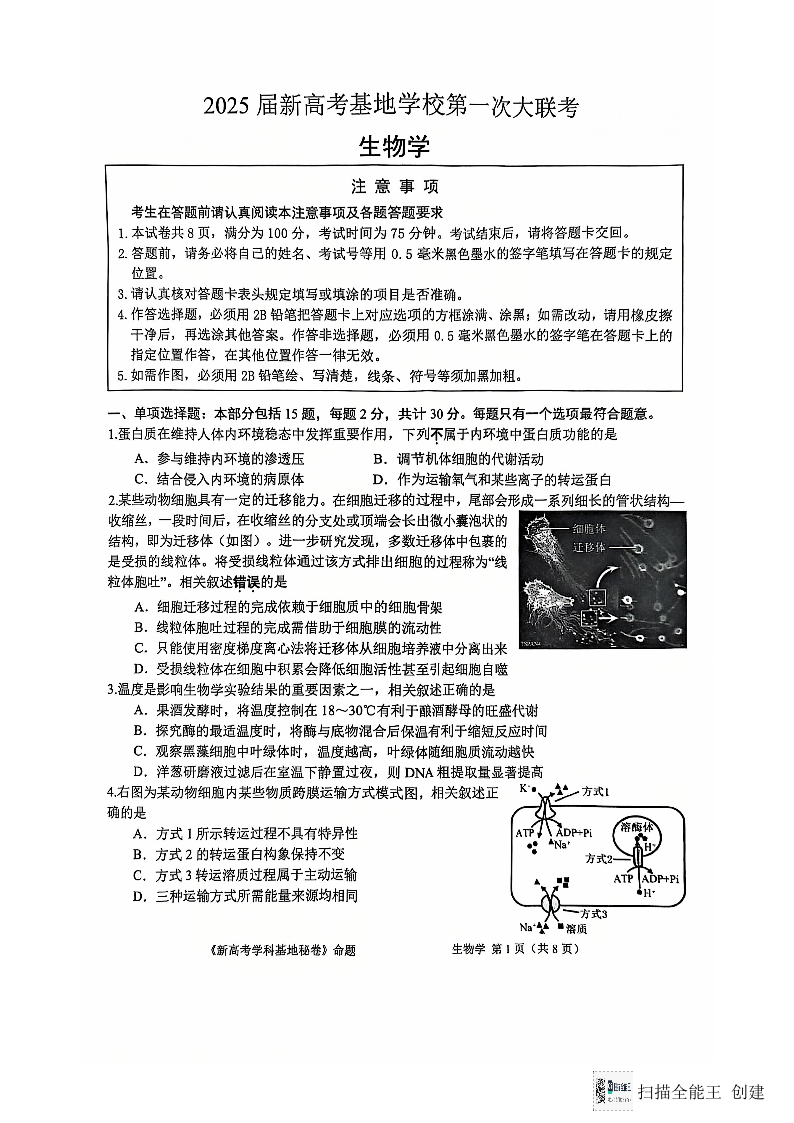 江苏省南通市新高考基地学校2025届高三上学期12月月考生物