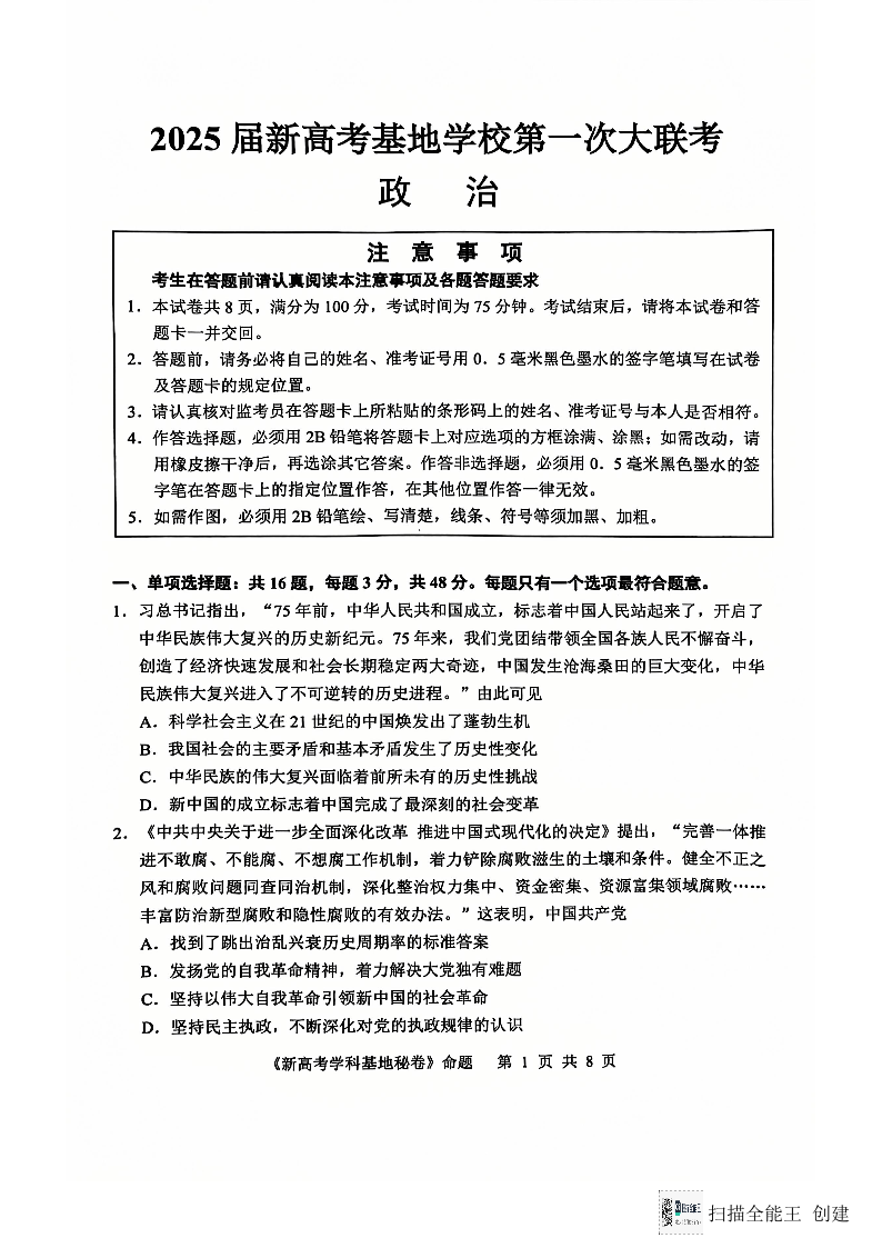 江苏省南通市新高考基地学校2025届高三上学期12月月考政治