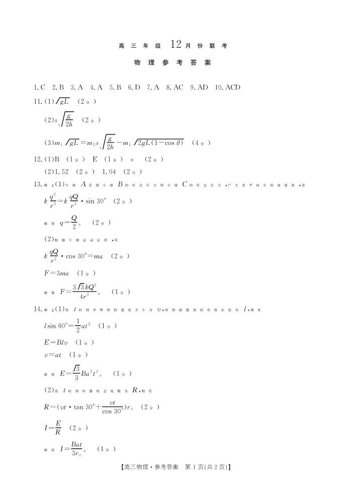 河北省保定市十县一中2025届高三上学期12月联考试题物理答案
