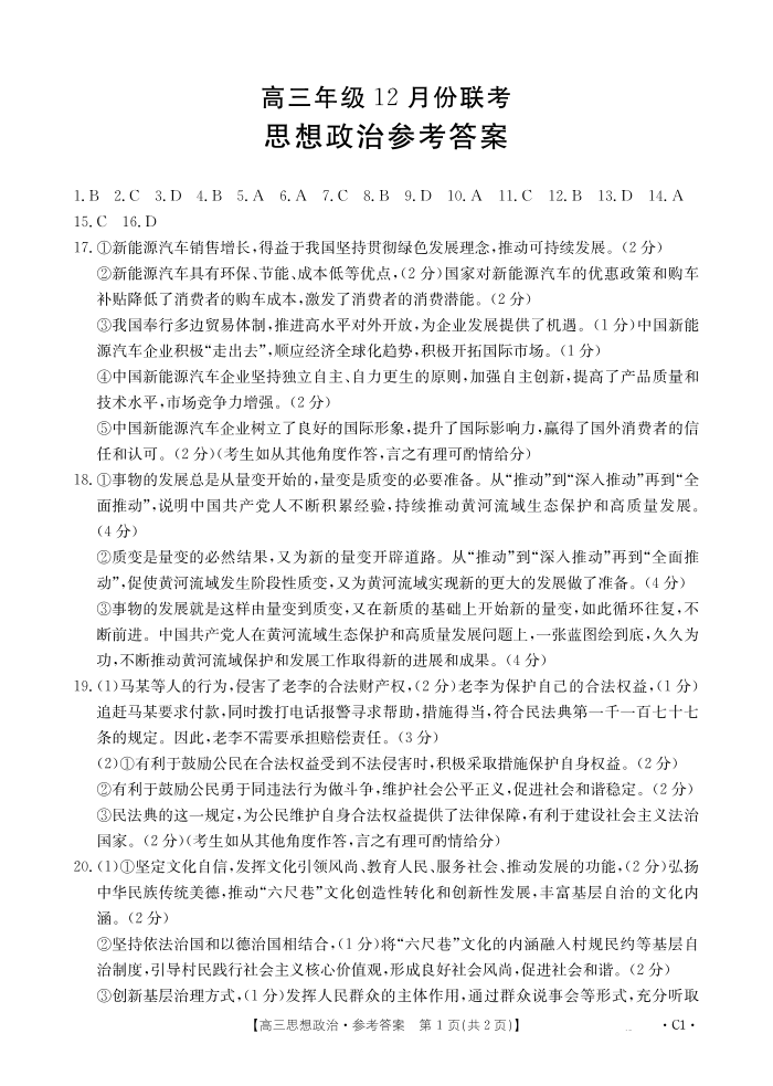 河北省保定市十县一中2025届高三上学期12月联考试题政治答案