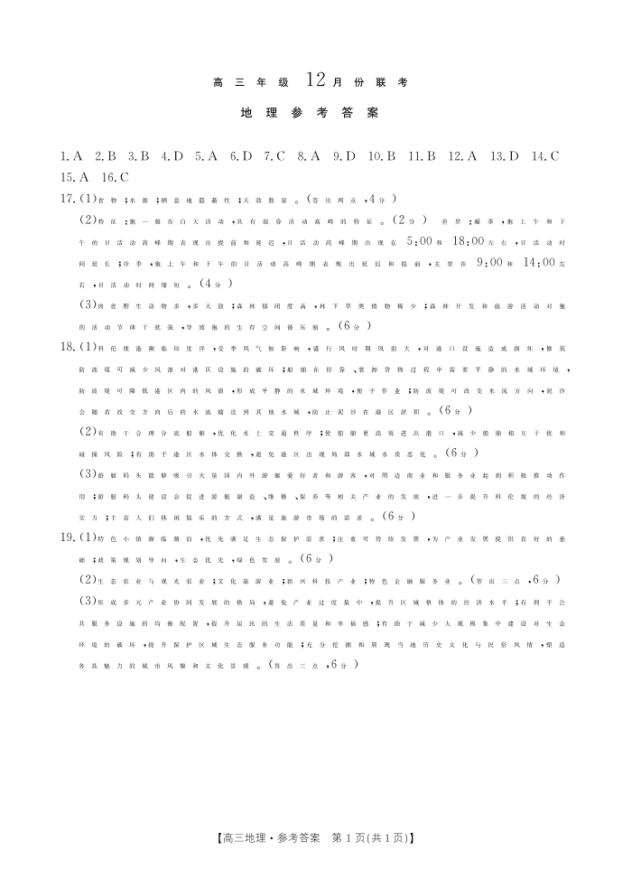 河北省保定市十县一中2025届高三上学期12月联考试题地理答案