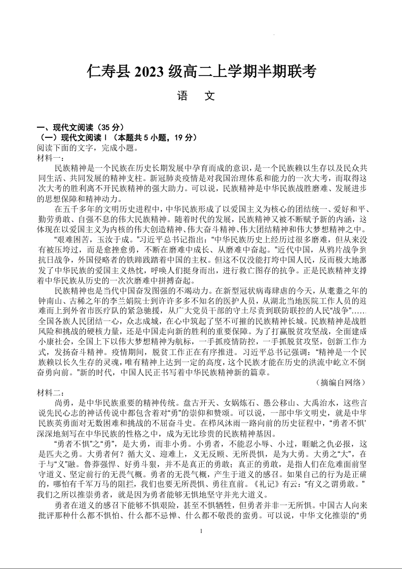 四川省眉山市仁寿县2024-2025学年高二上学期11月期中联考语文