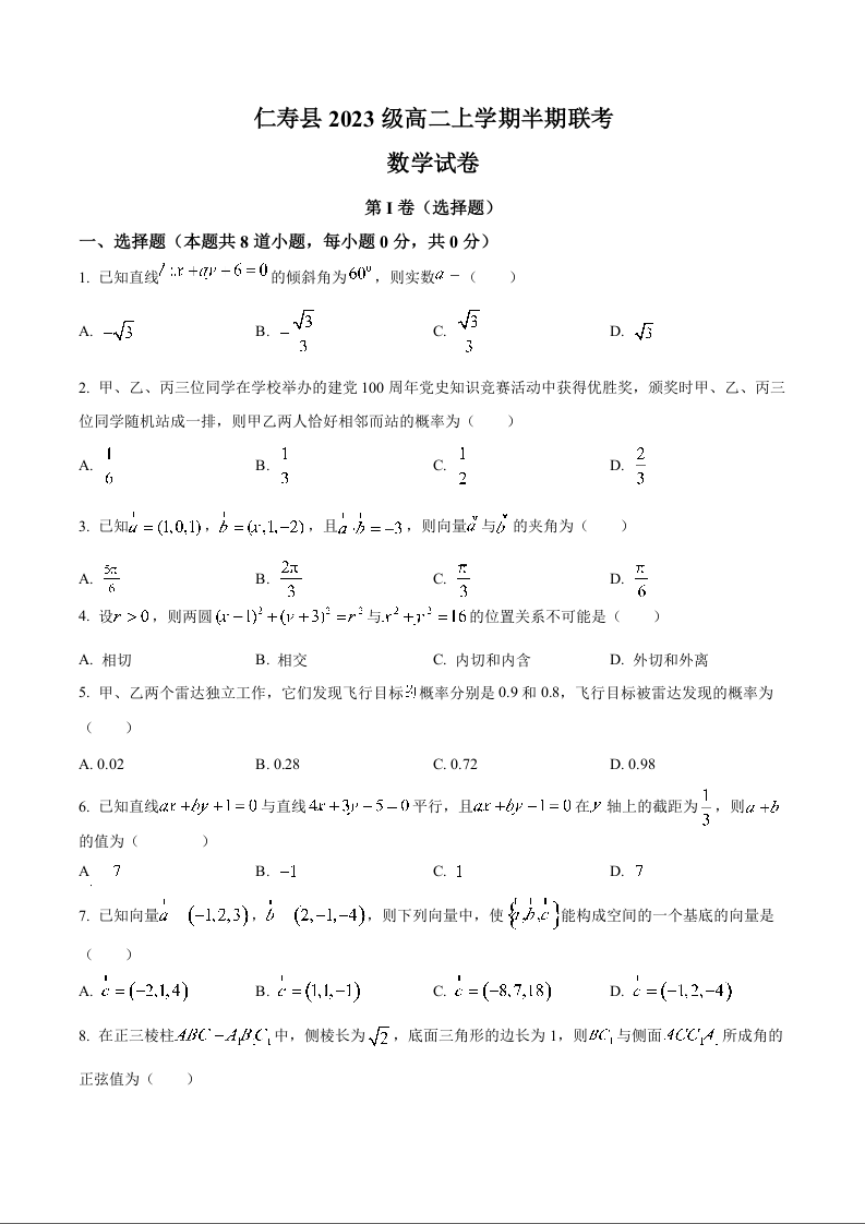 四川省眉山市仁寿县2024-2025学年高二上学期11月期中联考数学(原卷版)