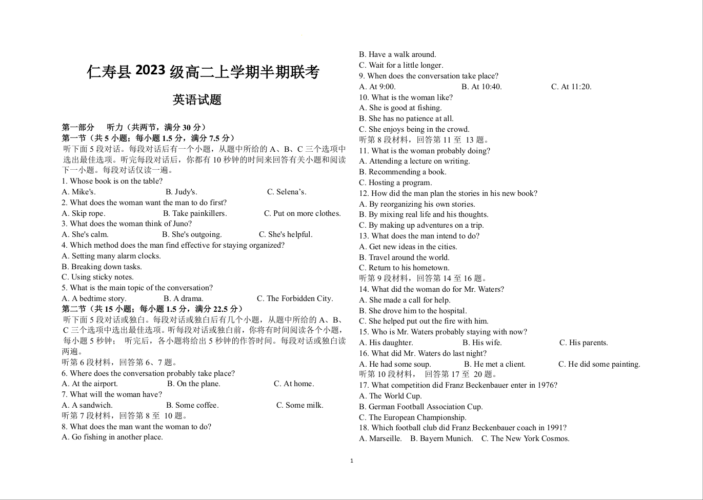 四川省眉山市仁寿县2024-2025学年高二上学期11月期中联考英语