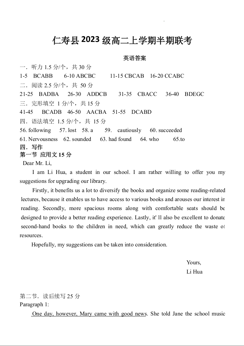 四川省眉山市仁寿县2024-2025学年高二上学期11月期中联考英语答案