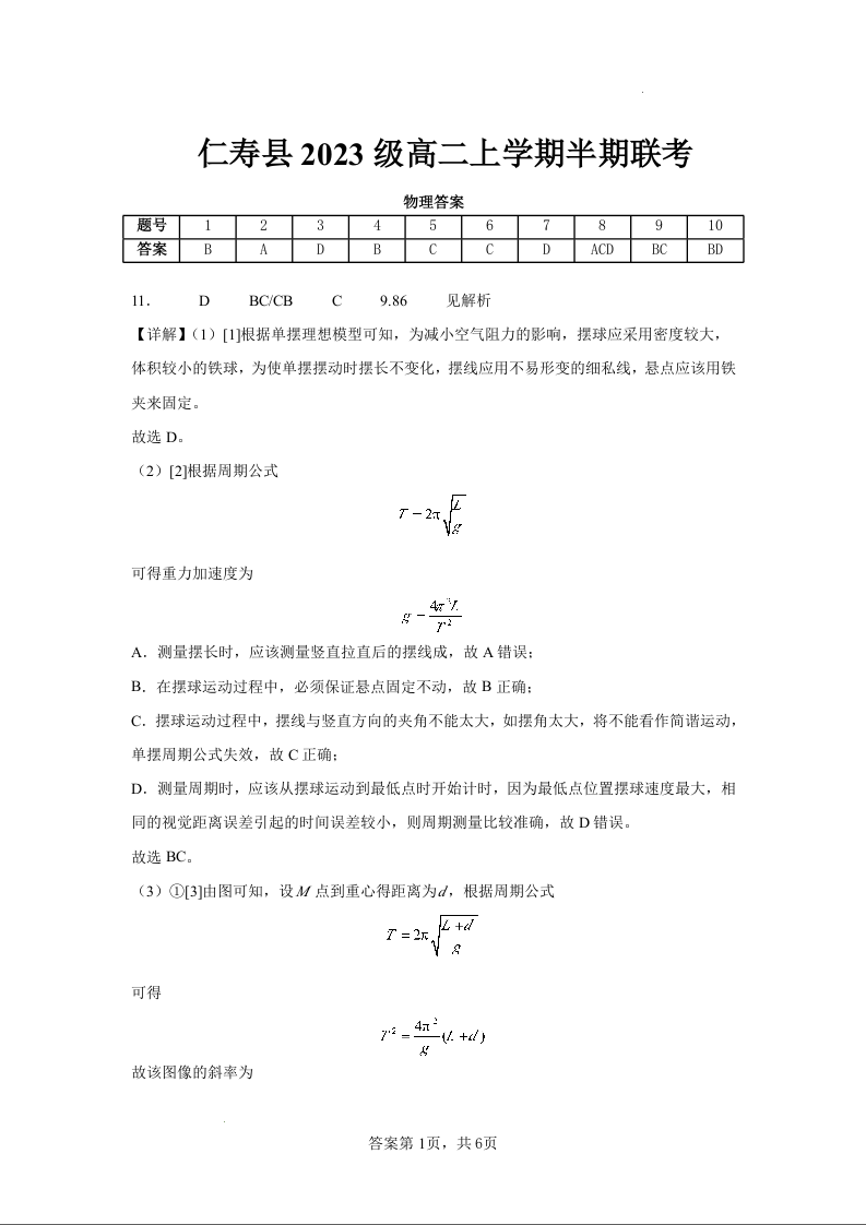 四川省眉山市仁寿县2024-2025学年高二上学期11月期中联考物理答案