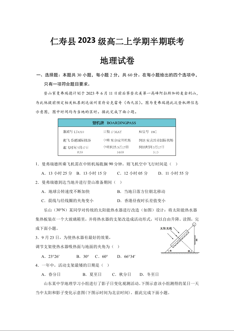 四川省眉山市仁寿县2024-2025学年高二上学期11月期中联考地理