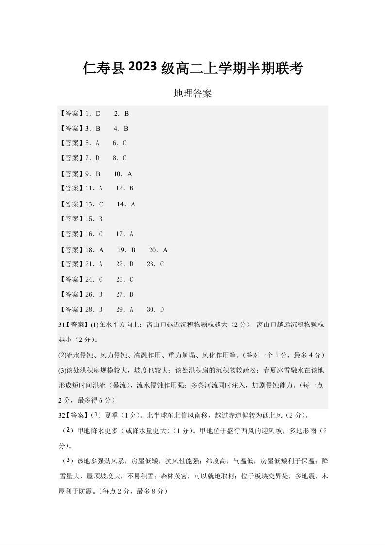 四川省眉山市仁寿县2024-2025学年高二上学期11月期中联考地理答案