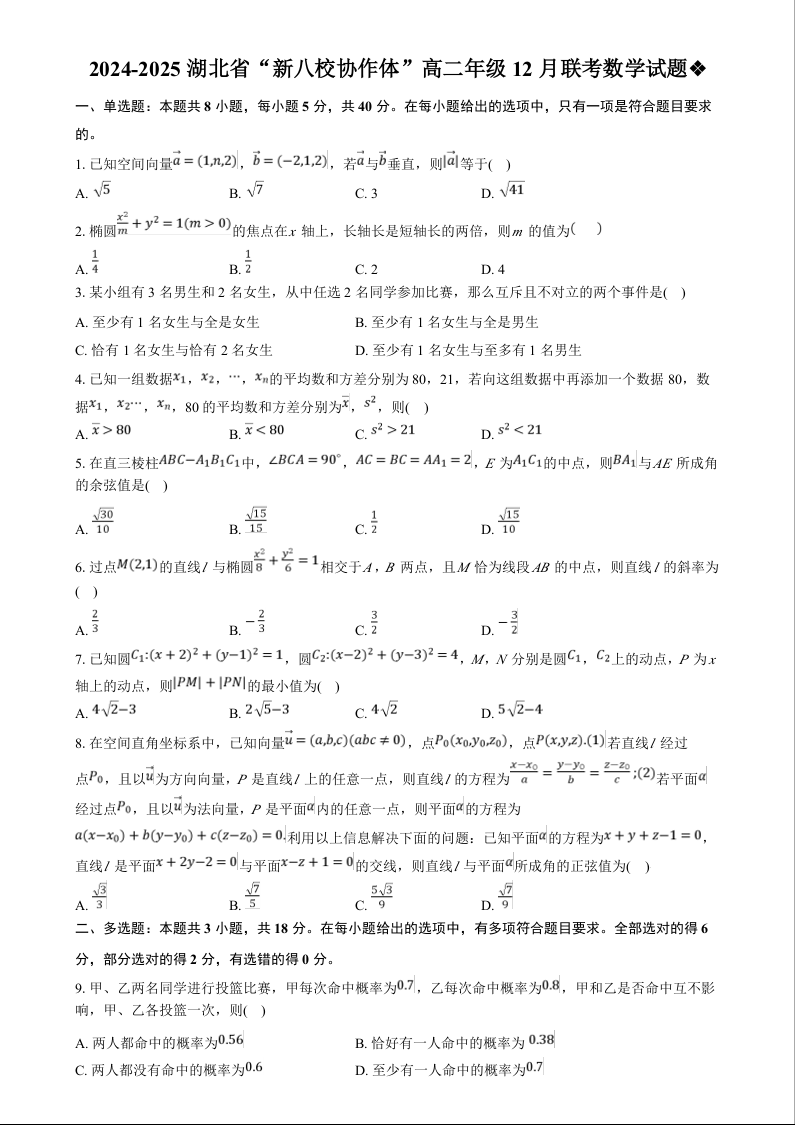 湖北省新八校协作体2024-2025学年高二上学期12月联考数学+答案解析
