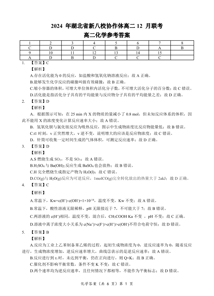 湖北省新八校协作体2024-2025学年高二上学期12月联考化学答案