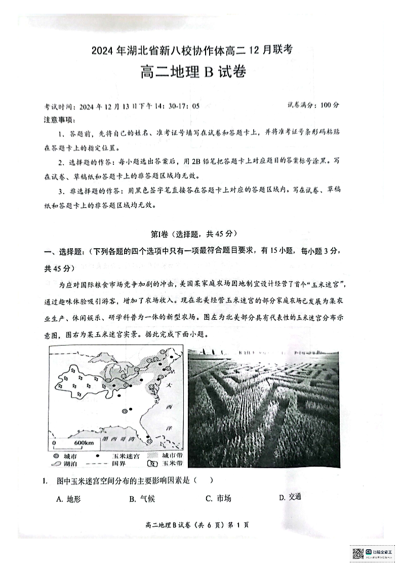 湖北省新八校协作体2024-2025学年高二上学期12月联考地理