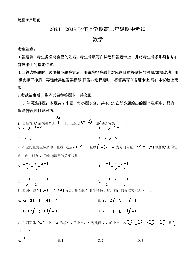 河南省濮阳市2024-2025学年高二上学期11月期中考试数学(原卷版)