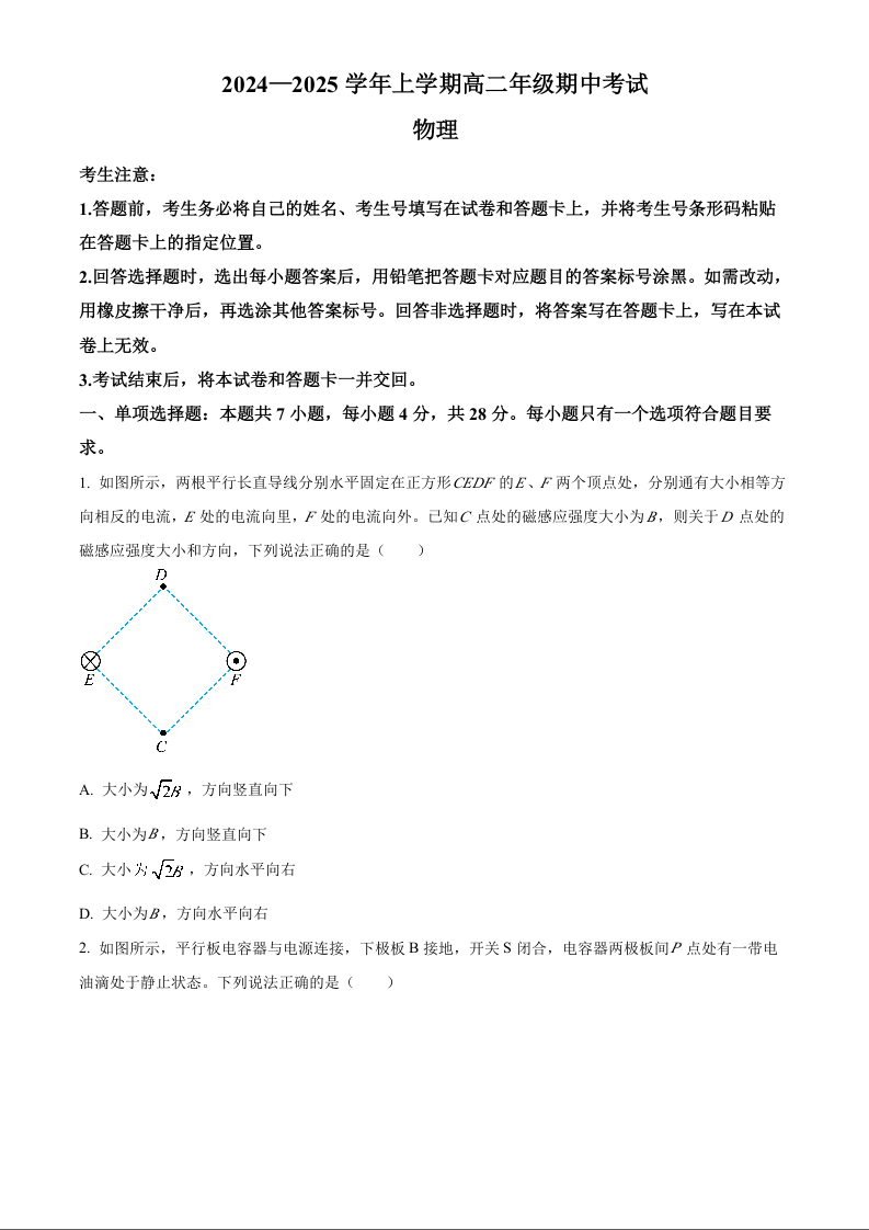河南省濮阳市2024-2025学年高二上学期11月期中考试物理(原卷版)