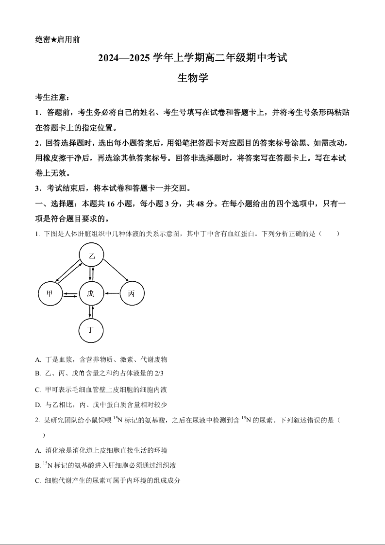 河南省濮阳市2024-2025学年高二上学期11月期中考试生物(原卷版)