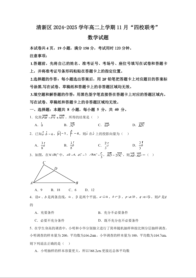 广东省清远市四校联考2024-2025学年高二上学期11月月考数学+答案解析