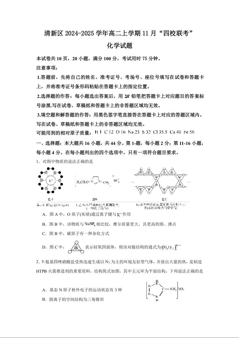 广东省清远市四校联考2024-2025学年高二上学期11月月考化学+答案解析