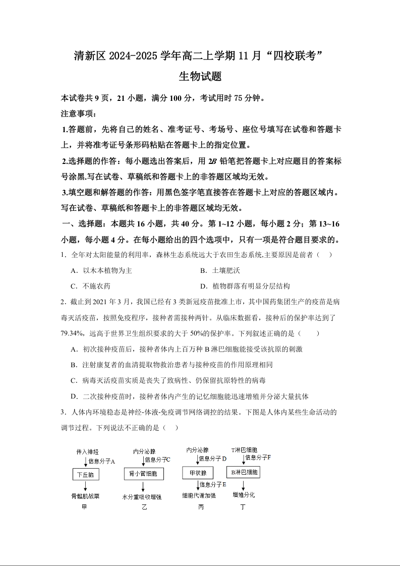 广东省清远市四校联考2024-2025学年高二上学期11月月考生物+答案解析