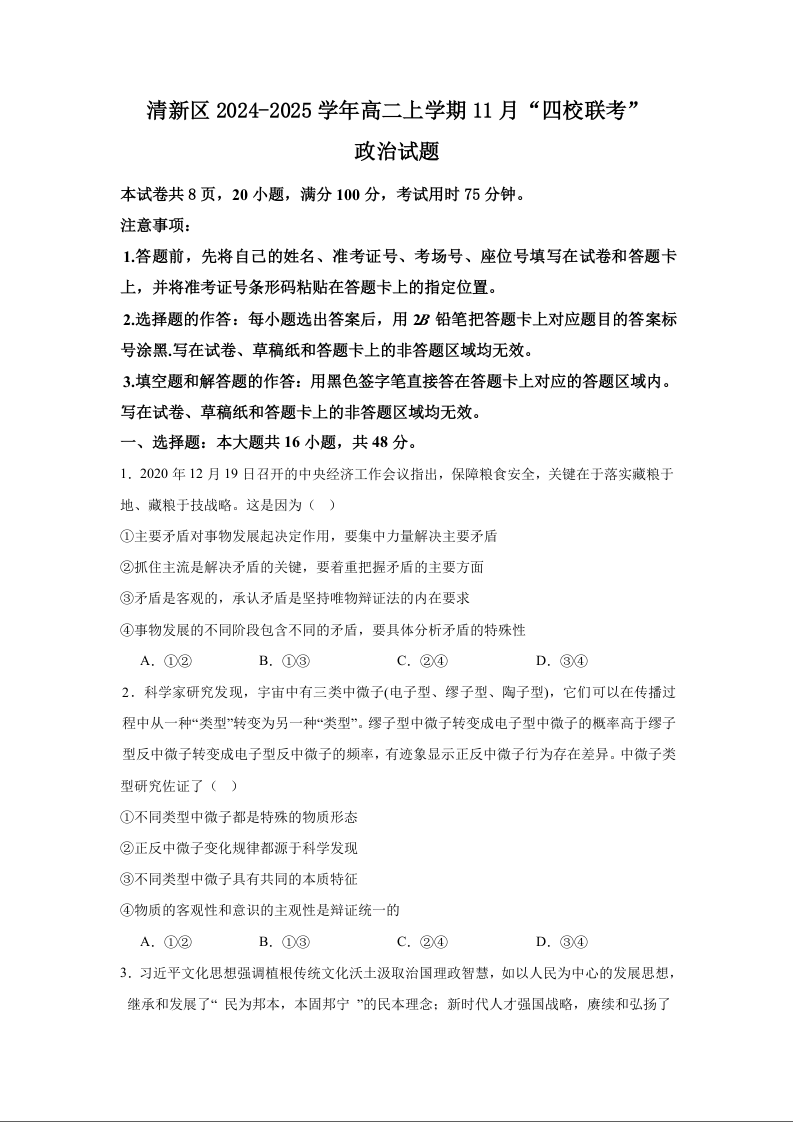 广东省清远市四校联考2024-2025学年高二上学期11月月考政治+答案解析