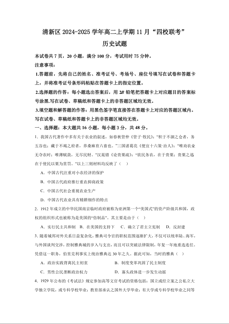 广东省清远市四校联考2024-2025学年高二上学期11月月考历史+答案解析
