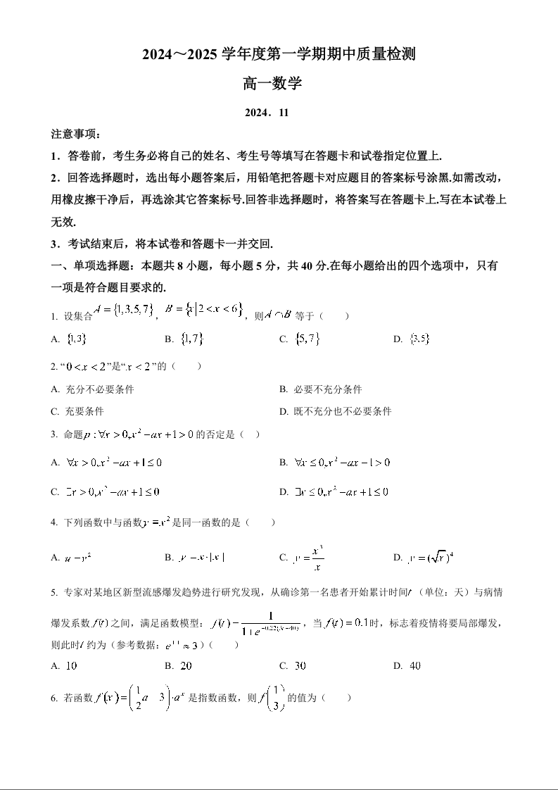 山东省枣庄市滕州市2024-2025学年高一上学期11月期中考试数学