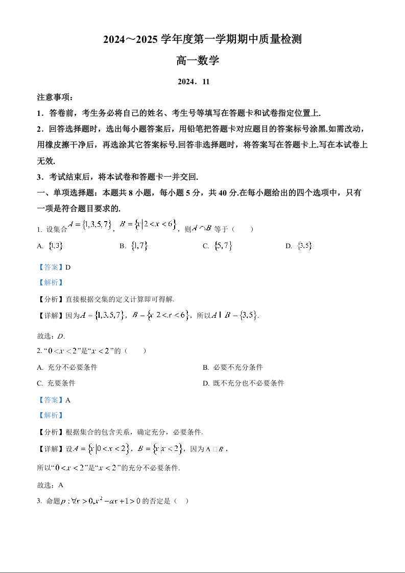 山东省枣庄市滕州市2024-2025学年高一上学期11月期中考试数学答案+解析