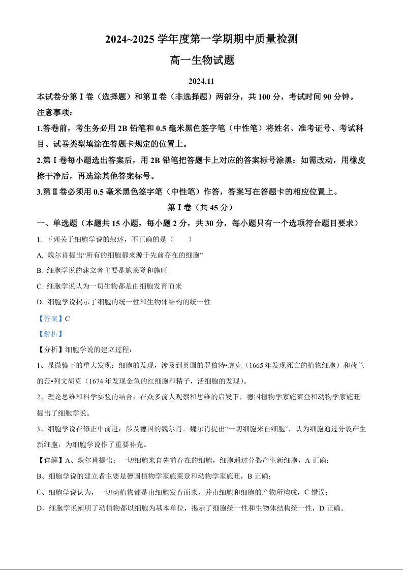 山东省枣庄市滕州市2024-2025学年高一上学期11月期中考试生物+解析