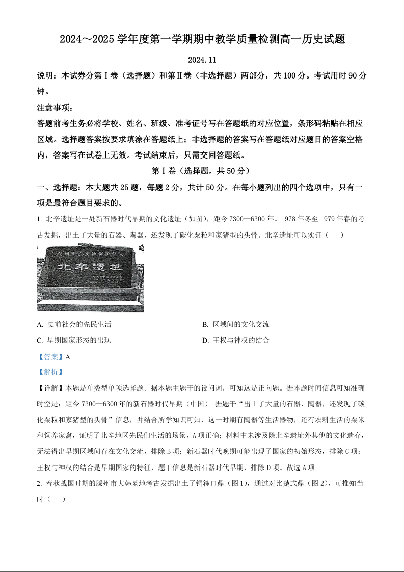 山东省枣庄市滕州市2024-2025学年高一上学期11月期中考试历史答案+解析