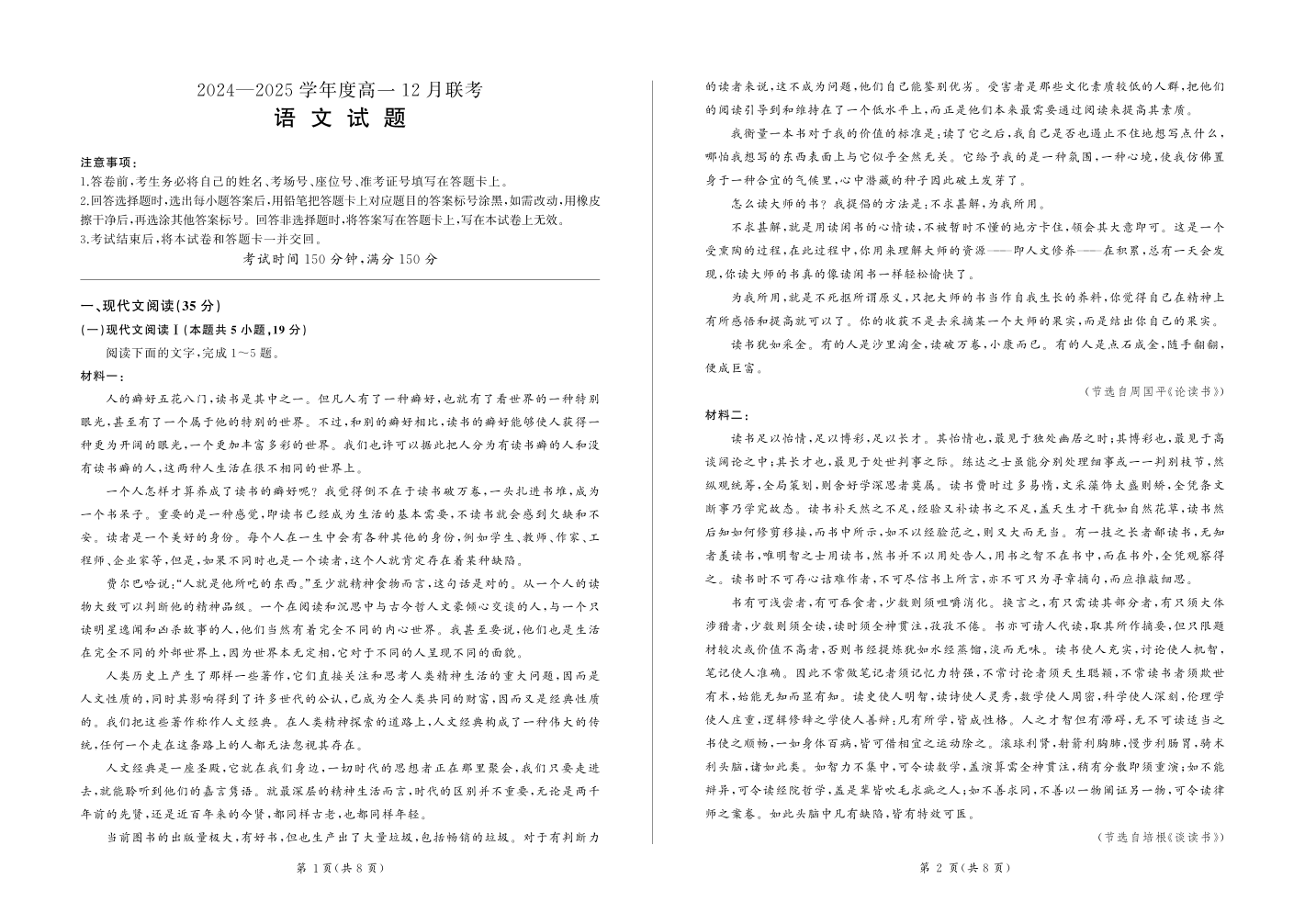 山东省百师联考2024-2025学年高一上学期12月月考语文