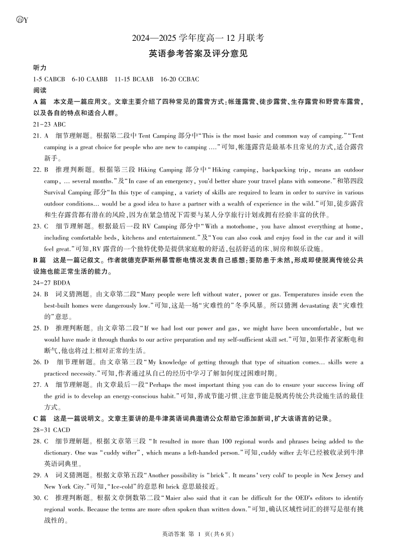 山东省百师联考2024-2025学年高一上学期12月月考英语答案