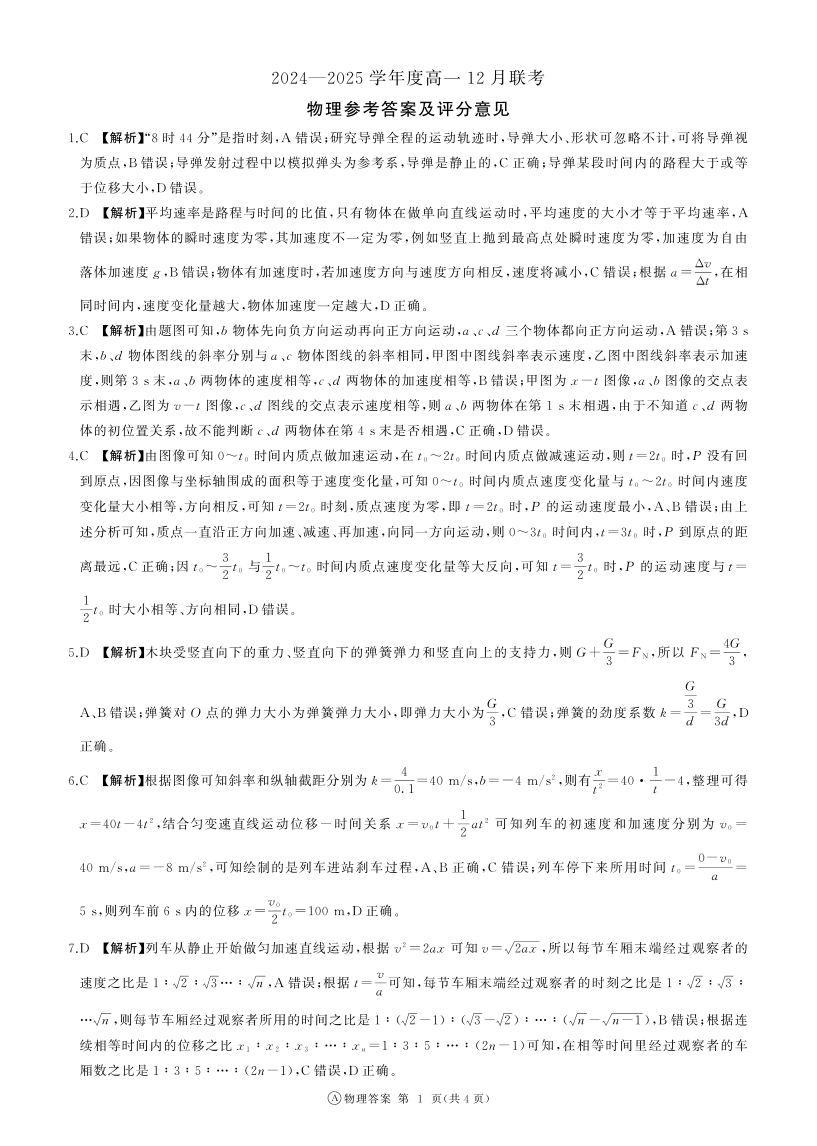 山东省百师联考2024-2025学年高一上学期12月月考物理答案