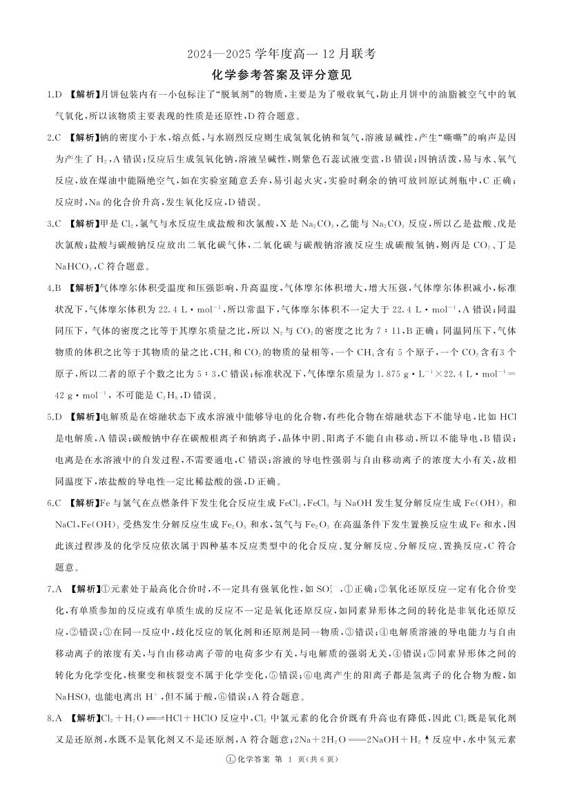 山东省百师联考2024-2025学年高一上学期12月月考化学答案