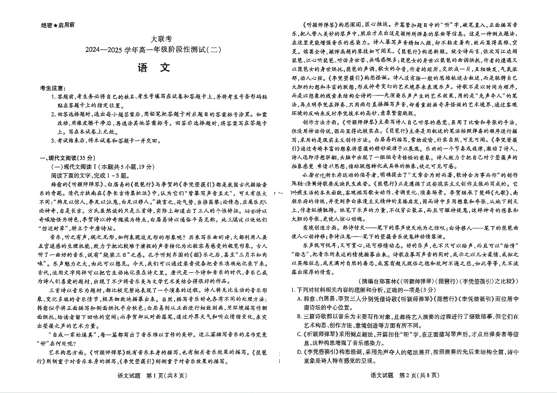 河南省区域高中2024-2025学年高一年级12月阶段性测试(二)语文