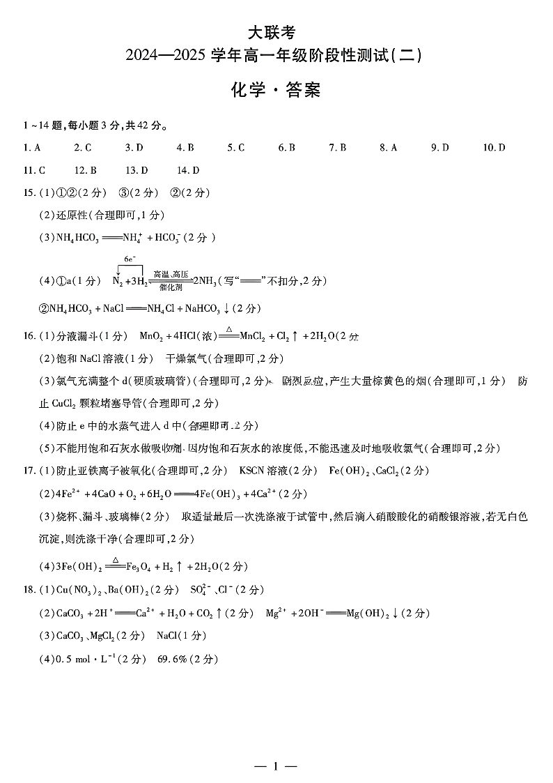 河南省区域高中2024-2025学年高一年级12月阶段性测试(二)化学答案