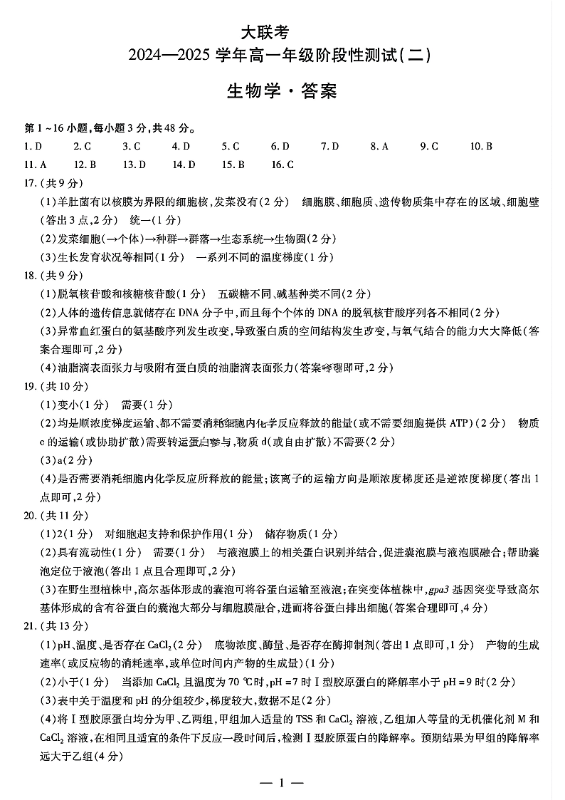 河南省区域高中2024-2025学年高一年级12月阶段性测试(二)生物答案