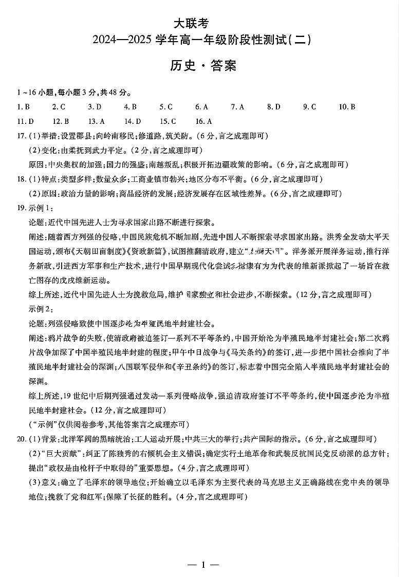 河南省区域高中2024-2025学年高一年级12月阶段性测试(二)历史答案