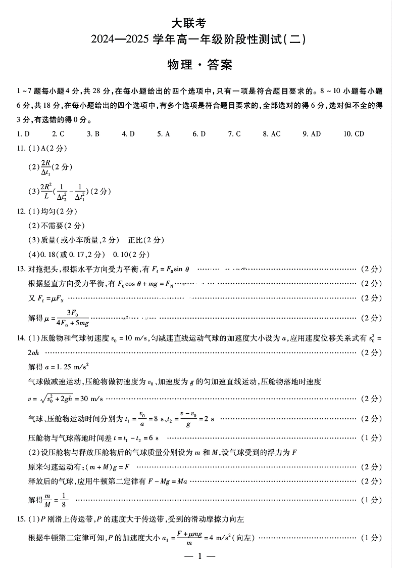 河南省区域高中2024-2025学年高一年级12月阶段性测试(二)物理答案