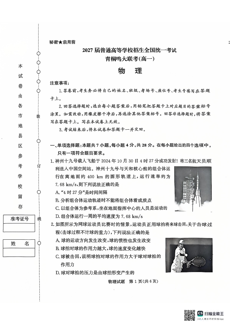 河南省青桐鸣2024-2025学年高一上学期12月大联考物理+答案