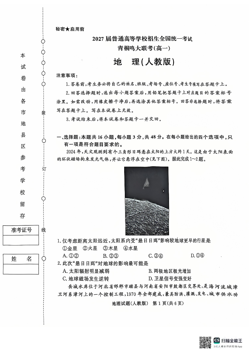 河南省青桐鸣2024-2025学年高一上学期12月大联考地理+答案