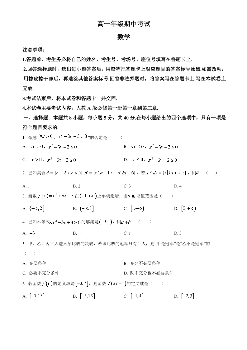 河北省唐山市2024-2025学年高一上学期11月期中考试数学