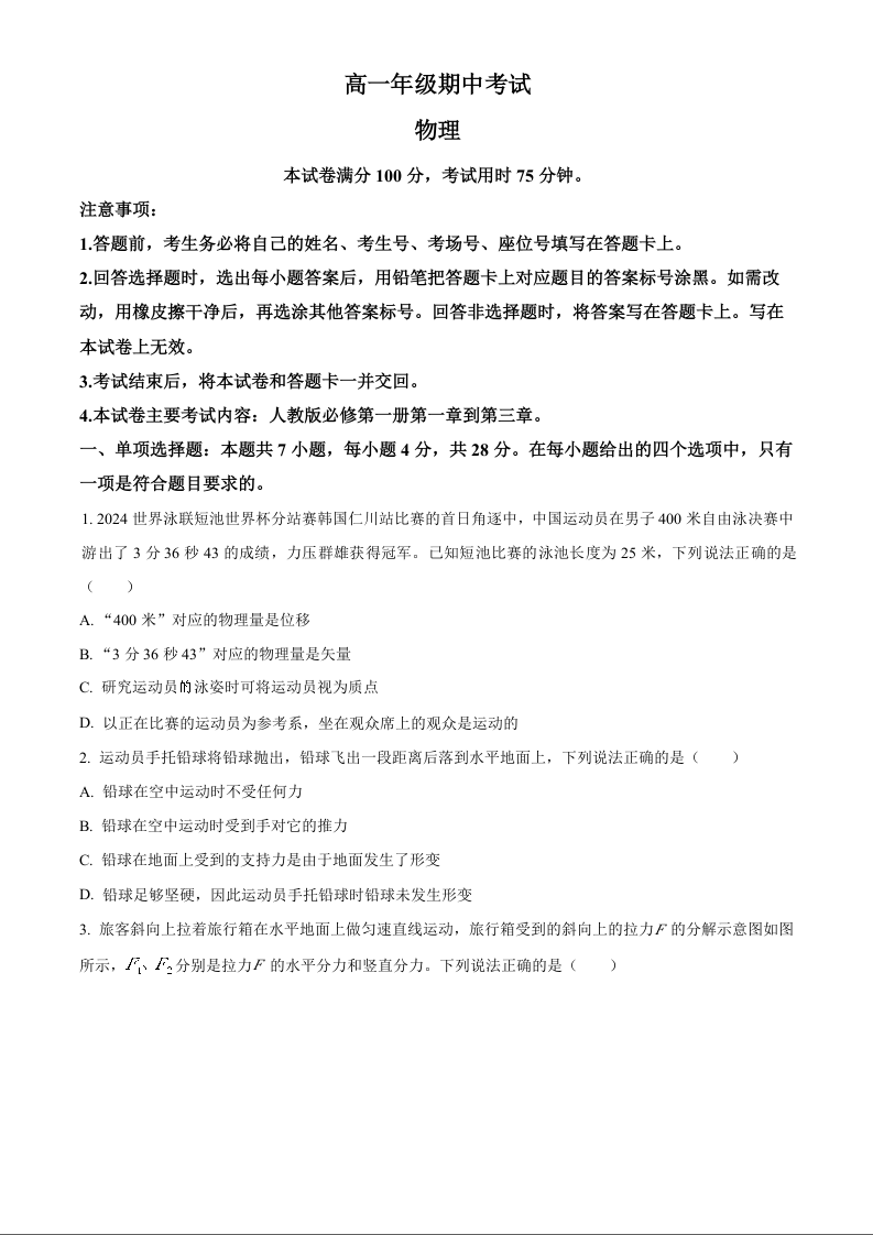 河北省唐山市2024-2025学年高一上学期11月期中考试物理