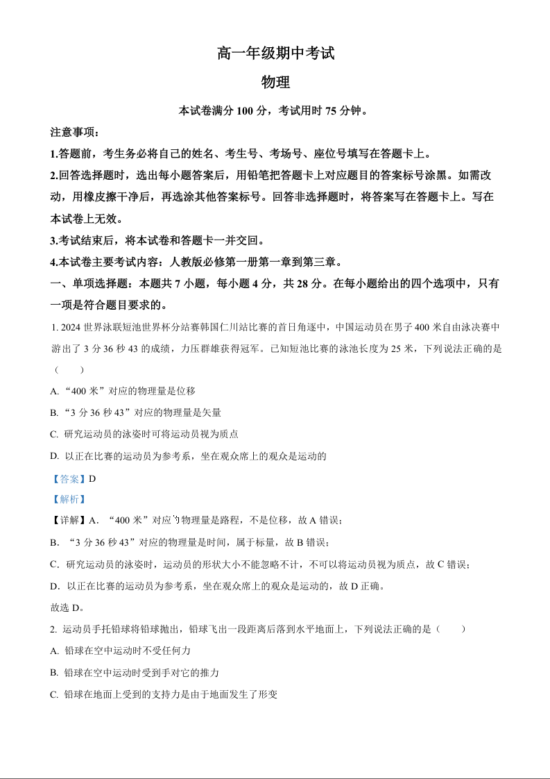 河北省唐山市2024-2025学年高一上学期11月期中考试物理答案+解析