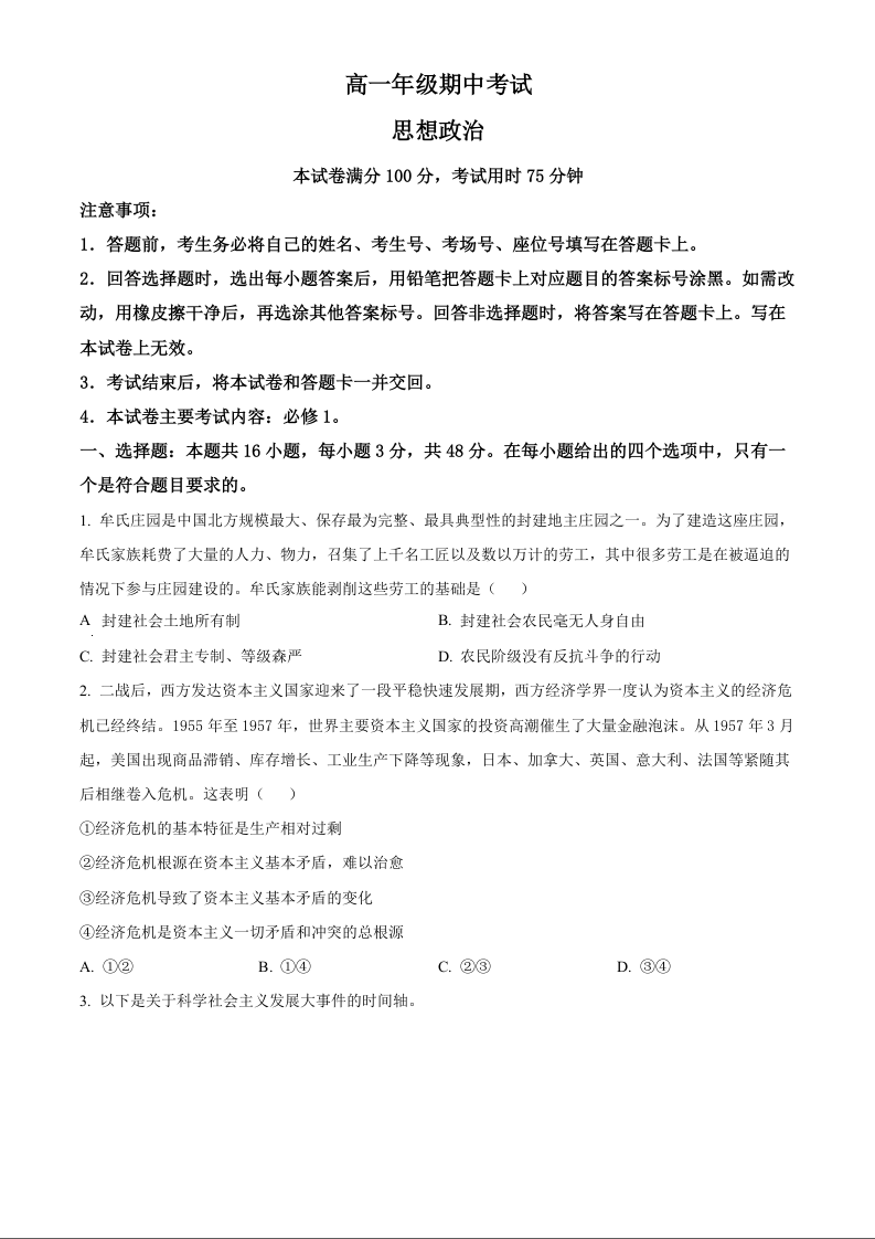 河北省唐山市2024-2025学年高一上学期11月期中考试政治