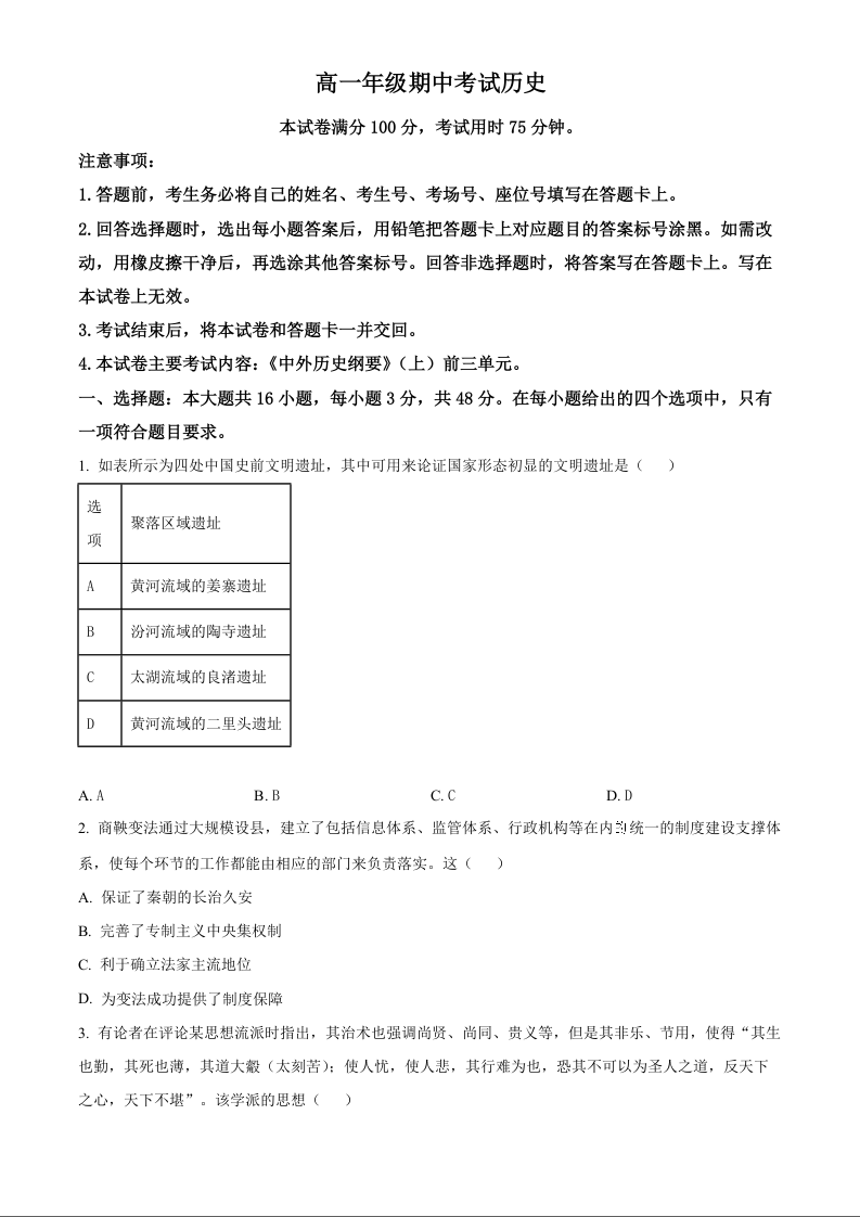 河北省唐山市2024-2025学年高一上学期11月期中考试历史