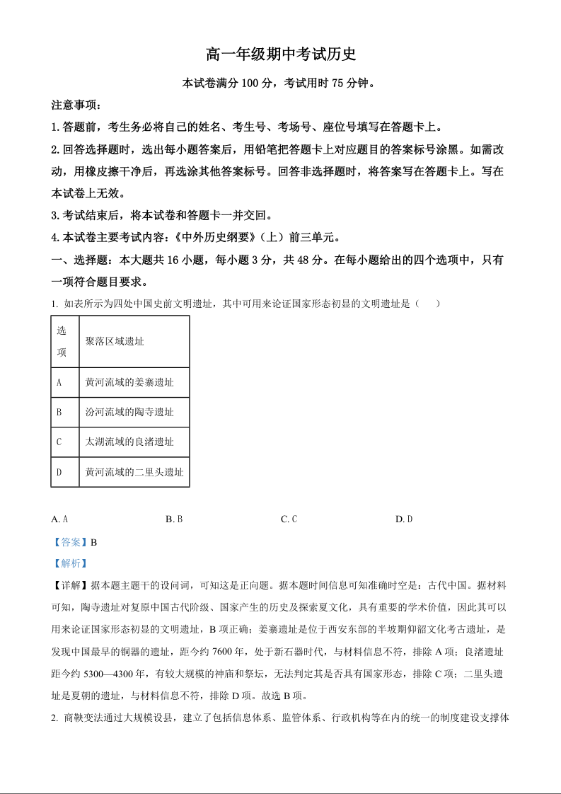 河北省唐山市2024-2025学年高一上学期11月期中考试历史答案+解析