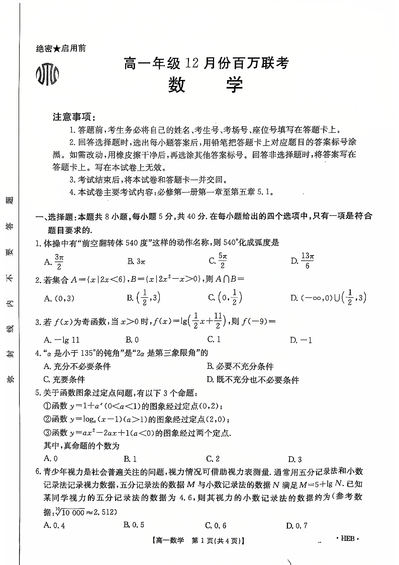 河北省百万联考2024-2025学年高一上学期12月联考数学
