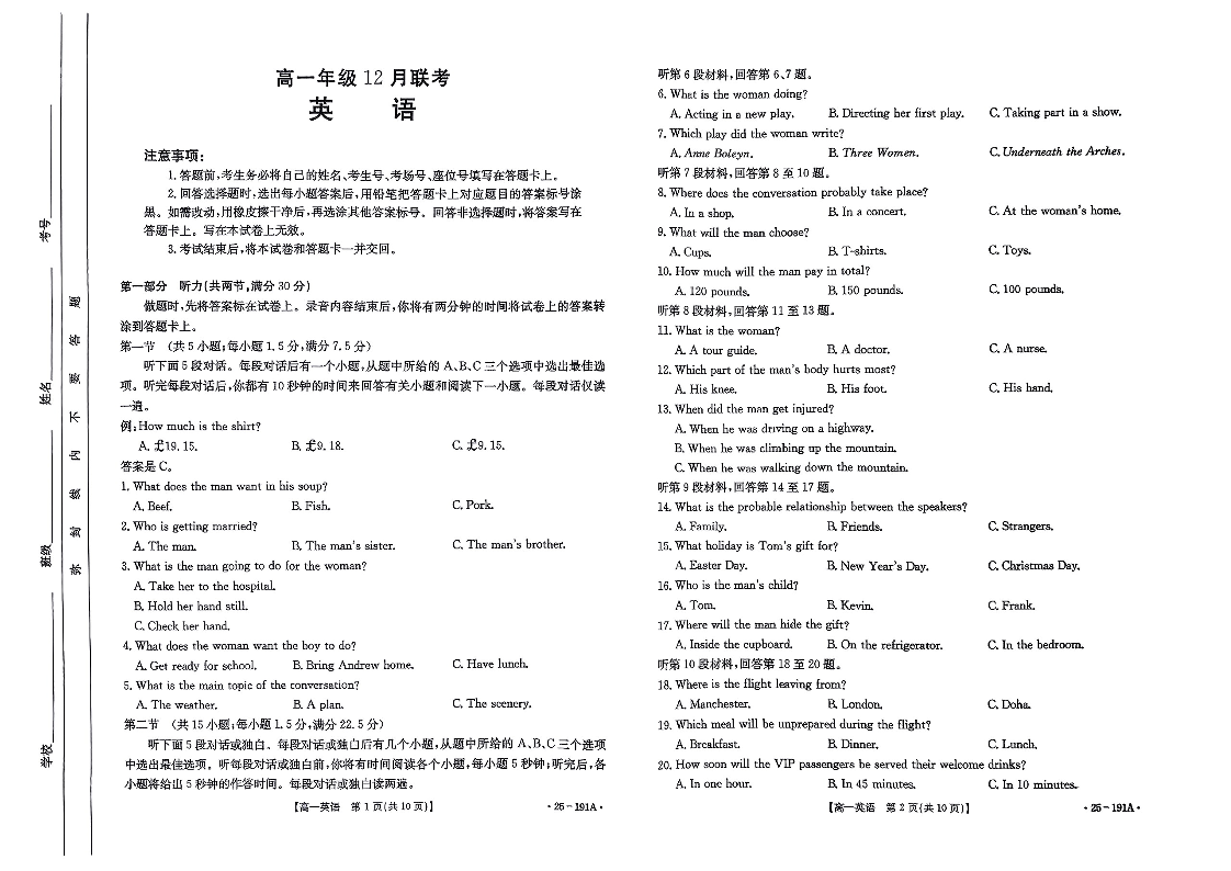 河北省百万联考2024-2025学年高一上学期12月联考英语