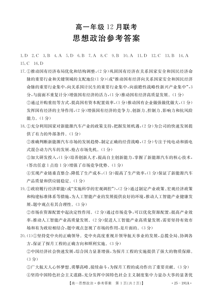 河北省百万联考2024-2025学年高一上学期12月联考政治政治答案