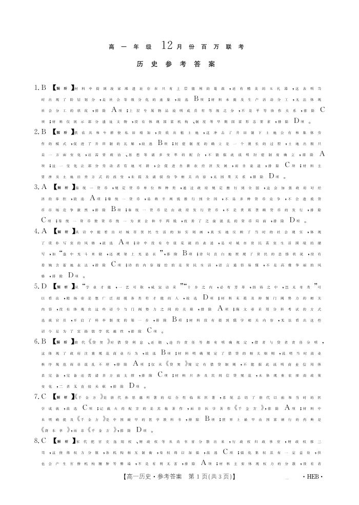 河北省百万联考2024-2025学年高一上学期12月联考历史答案