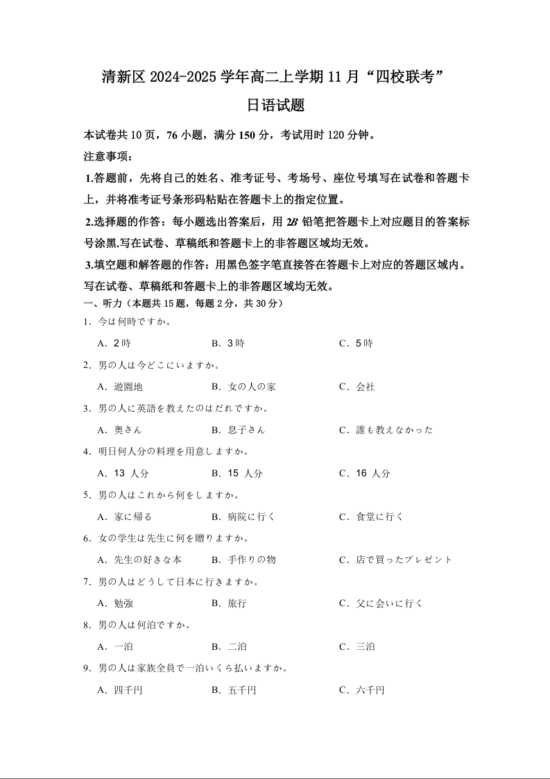 广东省清远市四校联考2024-2025学年高二上学期11月月考日语+答案解析